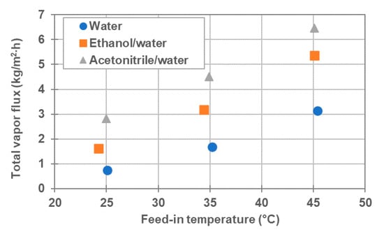 Furthermore, the total vapor flux increased as the feed-in temperature increased, even in the presence of an organic solvent. Figure 7 shows the total vapor flux for three kinds of feeds as a function of feed-in temperature. As illustrated, the total vapor flux was observed to increase due to the inclusion of the organic solvent. Additionally, it was found that the total vapor flux for the mixture of acetonitrile/water mixture is slightly higher than that for ethanol/water.