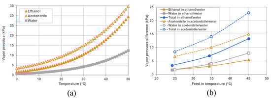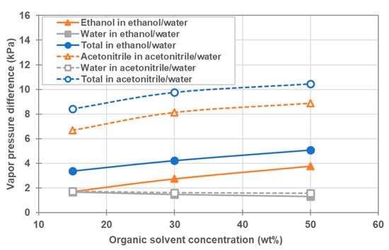 These phenomena are qualitatively explained as follows: As shown in Equation (11), the partial vapor pressure increases with the molar fraction and the activity coefficient. Table 8 shows the activity coefficient, and vapor pressure of organic solvent and water in the feed and the permeate, which were calculated from the operating conditions of feed-in temperature, coolant-in temperature and molar fraction shown in Table 7. As shown in Table 8, the molar fraction of acetonitrile is higher than that of ethanol in the mixture with the same wt%, and the activity coefficient of acetonitrile is higher than that of ethanol. In addition, as shown in Figure 8a, the vapor pressure of pure acetonitrile is higher than that of pure ethanol at the same temperature. Thus, the partial vapor pressure of acetonitrile is higher than that of ethanol in the organic solvent/water mixture with the same wt% at the same temperature. To clearly show this situation, Figure 10 shows the vapor pressure difference at the startup of operation, under each condition. It is obvious from Figure 10 that the total vapor pressure difference and the partial vapor pressure difference of the organic solvent simultaneously increased with the increase in its molar fraction. In addition, the partial vapor pressure differences of acetonitrile and of ethanol are higher than that of water, and the partial vapor pressure difference of acetonitrile is higher than that of ethanol. Consequently, the total vapor flux and the solvent flux simultaneously increased with the increase of the molar fraction of the organic solvent. In addition, the total vapor flux and the solvent flux for the acetonitrile/water mixture were higher than those of the ethanol/water mixture, since the total vapor pressure difference and the partial vapor pressure difference of the acetonitrile/water organic solvent mixture were higher than those of the ethanol/water mixture.