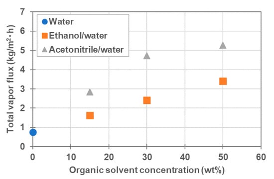 The effect of the concentration of organic solvents in the feed was also investigated. Herein, the organic solvent/water mixture containing 1000 ppm NaCl was used as the feed, and the feed-in temperature and the coolant-in temperature were set to ≈25 °C and ≈10 °C, respectively. The concentrations of ethanol and acetonitrile in the mixture were varied from 15–50 wt%. The experimental conditions and results are listed in Table 7. The total vapor flux is plotted in Figure 9 as a function of the concentration of organic solvents, including pure water. As observed, the total vapor flux of organic solvent/water mixture was higher than that of pure water and increased as the organic solvent fraction increased. Additionally, as shown in Table 7, the organic solvent flux increased as the organic solvent fraction increased. Moreover, the total vapor flux and the organic solvent flux for the acetonitrile/water mixture were higher than for the ethanol/water mixture.