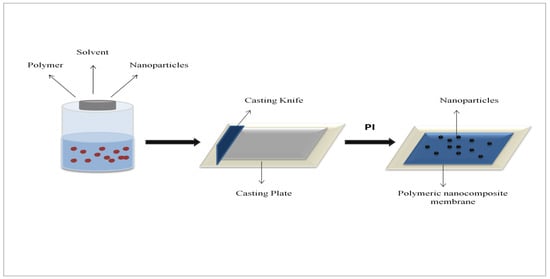 The preparation of the SGO-blended CA membrane was done using non-solvent-induced phase inversion (NIPS) [27]. The compositions of casting solutions of CA, THF as solvent, and the desired concentration of SGO nanomaterials are given in Table 1. In the beginning, the precise SGO nanoparticle amount was poured into THF solvent and dispersed for 30 min using a sonicator (ultrasonic water bath) for improvement in homogeneity. On other side, CA was added into the THF solution and under continuous stirring was poured with the dispersion of SGO at room temperature. For better dispersion of SGO, nanomaterials into CA matrix and elimination of air bubbles the solution was kept for 24 h. The casting solution was then ready to be casted using casting glass plate with thickness of (150 μm) and casting knife, and the film so obtained was then submerged into coagulation bath containing distilled water for almost 2–3 min. Afterwards, the prepared film was detached from casting plate by washing three times using pure water. The membrane so obtained was allowed to dry at room temperature and then stored for further use (Figure 1).