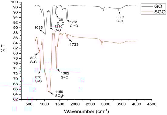The analysis of sample using FTIR was done for the determination of functional groups. Graphene oxide and SGO were analyzed using this spectroscopic technique. The FTIR spectra given in Figure 2 give the comparison among sulfonated graphene oxide (SGO) and GO. GO shows its characteristic peaks at 3000–3389 cm−1 corresponding to hydroxyl (–OH) group and peak at 1731 cm−1 to carbonyl (C=O) groups, whereas at 1210, 1035 cm−1, 1361 cm−1 is related to stretching vibrations of epoxy (C–O), alkoxy (C–O) groups, and C=C aromatic bonds (un-oxidized sp2), respectively [26]. The peak obtained at 1150 cm−1 corresponds to group, i.e., of sulfonic acid [–SO3H], whereas it is absent in GO spectrum. The peak at 1733 cm−1 in spectrum is decreased as in GO, which showed that in process of sulfonation the graphite oxide is reduced partially. The sharp peaks obtained at 1204 cm−1 and 1382 cm−1 reveal asymmetric and symmetric S=O stretching modes, confirming the successful substitution of sulfonic groups upon the GO surface. The peaks obtained close to 823 cm−1 and 875 cm−1 are related to stretching modes of S–C and S–O bonds, respectively, signifying the covalent existence of –SO3H on the surface of reduced GO. The reduction in broad peak at 3369 cm−1 suggested the partial reduction of sulfonated GO [30].