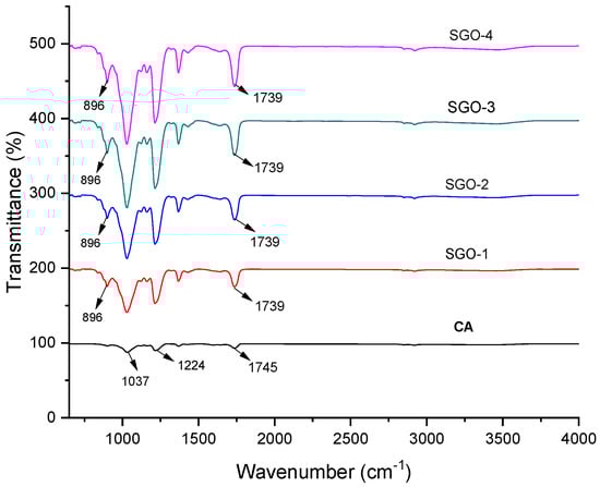 The FTIR spectra of pristine CA and CA-SGO nanocomposite membranes at various concentrations (SGO-1 = 0.02%; SGO-2 = 0.06%; SGO-3 = 0.1%; SGO-4 = 0.14%) are shown in Figure 3. Characteristic peaks exhibited by pure CA membrane are at 1037, 1224, 1369, and 1745 cm−1 which corresponds to C–O cm−1, C–O–C cm−1, C–CH3 cm−1, C=O cm−1, and O–H cm−1 stretching modes of vibration. The IR absorptions frequency of pristine CA membrane is almost identical to CA–SGO nanocomposite membranes. However, the characteristic peaks exhibited by SGO at 823 and 896 cm−1 related to stretching mode of vibration for S–O and S–C, respectively. The presence of peak at 1739 cm−1 in spectrum for all SGO membranes showed that in process of sulfonation the graphite oxide is reduced partially.