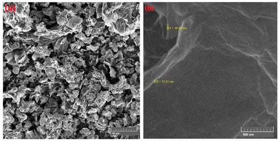 Figure 5a,b shows the morphological features of SGO with particles sizes determined. The SEM analysis indicates the thickness in the range of 11 to 14 nm for prepared SGO nanoparticles. Moreover, particle size was also calculated through Scherrer calculator feature, which measured particle size of 6–8 nm thus confirms the fabrication of sulfonated graphene oxide [32].