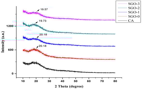 The crystallinity of CA-SGO nanocomposite membranes, determined by XRD analysis, reflects the halo amorphous structure as shown in Figure 6. An amorphous halo exits within the range of 15 to 30°. The existence of broader peaks at 2 theta values of 19.57 and 20.18 corresponds to GO and SGO, respectively. It suggests that all the membranes exist in an amorphous structure. Similar patterns are reported in another work conducted in [3].