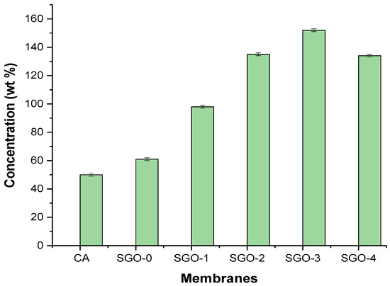 Contact angle measurement of membranes is widely used for characterizing the membrane surface hydrophilicity. One of the most significant characteristics of membranes is their hydrophilicity because it can influence the anti-biofouling ability and flux of membranes [12]. The highest contact angle of 70° is shown by CA membrane. After adding hydrophilic SGO nanofillers, a decrease in contact angle of composite membranes is observed which suggested better hydrophilicity and improved affinity of water for CA-SGO composite membranes (Figure 7). Furthermore, all CA-SGO membranes exhibited higher hydrophilicity than the CA–GO (SGO-0 membrane). This is attributed to the introduction of water holding sulfonic acid –SO3H, –COOH, and O–H moieties both on the surface and within the matrix of respective hybrid membranes.