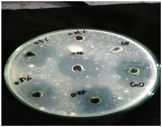 The antibacterial activity of fabricated CA-based SGO-doped membranes was evaluated via agar well diffusion method through measurement of inhibition zone. Our chosen testing microbe, Escherichia coli, was inoculated into the plate containing agar medium through spreading over whole space. Afterwards, five to six holes of 6 to 8 mm diameter were aseptically punched with a tip or sterile cork borer into a plate containing agar medium followed by introduction of antimicrobial extract solution and control with highest antibacterial activity (Ampicillin) using microliter syringe into wells which already contained E.coli as a testing microbe. The agar plates were then incubated under suitable conditions depending on the test microorganism. This causes diffusion of antimicrobial agent into agar medium which inhibits the tested microbial strain growth. The inhibition zone was developed against each well by antimicrobial extract. From Figure 9 and Figure 10, it is revealed that antibacterial activity is increased with increased content of SGO within CA membrane. The surface of CA-SGO composite membrane exhibited negative charge due to hydrophilic SGO functional groups like sulfonic acid and hydroxyl groups which creates electrostatic repulsion among microbe and membrane [14].