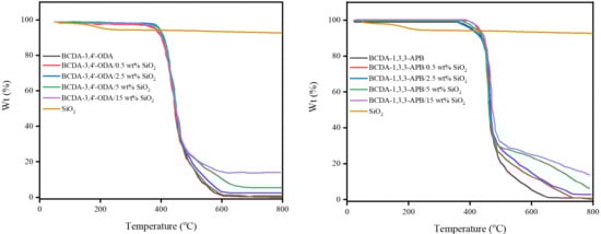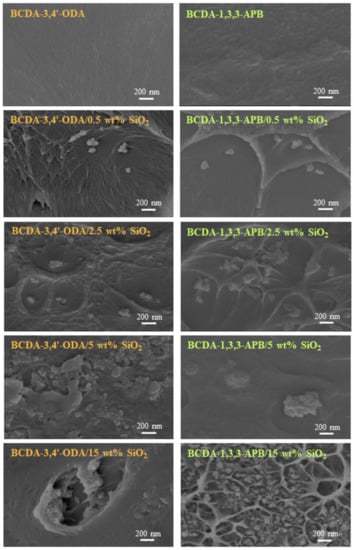 However, the results of water contact angle in Table 2 indicate that the incorporation of SiO2 nanoparticles in MMM exhibited the opposite tendency on hydrophilicity for a different PI matrix. Thus, the solvent solubilities of PI/SiO2 MMMs were investigated via measuring their solvent swelling degrees. The results are listed in Table 4. In the case of BCDA-3,4′-ODA/SiO2 MMMs, the increase in SiO2 wt% led to the decrease in the degree of swelling of pure water but an increase in pure butanol solubility. In contrast, an opposite trend was attained for BCDA-1,3,3-APB/SiO2 MMMs. These trends are in good agreement with the water contact angle results. Conclusively, the BCDA-3,4′-ODA/SiO2 MMMs became less hydrophilic due to the incorporation of SiO2 nanoparticles, whereas BCDA-1,3,3-APB/SiO2 MMMs were more hydrophilic with SiO2 loading. The phenomena on solvent swelling degrees displayed in the literature adopting chitosan/SiO2 xerogel MMMs [59] were similar to our BCDA-1,3,3-APB/SiO2 MMM case, since the tendency of water contact angle was the same.