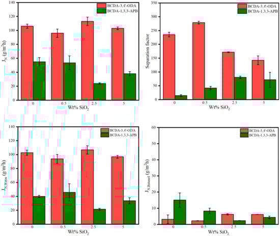 In the aspect of the separation factor, both PI/SiO2 MMMs displayed a similar effect: the separation factor increased first and then decreased with the increasing filler loading. Similar trends were also indicated in the literatures [56,59]. In Figure 6, the optimal separation factor occurred at 0.5 wt% for BCDA-3,4′-ODA/SiO2 MMMs and 2.5 wt% for BCDA-1,3,3-APB/SiO2 MMMs, which were identical to the SiO2 content for the minimal n-butanol flux in each case. The separation factor was raised mainly by the decrease in n-butanol flux. In addition, the incorporation of SiO2 nanoparticles was more effective for the case of BCDA-1,3,3-APB/SiO2 MMMs, especially to enhance the separation factor at 3–5.7-fold.
