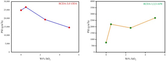 By combining the two important pervaporation outcomes (total flux and separation factor) together, the PSI value for each membrane was calculated as the index of separation efficiency. The PSI data are plotted in Figure 7. Based on the PSI performance, the optimal SiO2 content was 0.5 wt% for BCDA-3,4′-ODA/SiO2 MMMs and 5 wt% for BCDA-1,3,3-APB/SiO2 MMMs. In the case of BCDA-1,3,3-APB, the maximum PSI value did not occur at the maximal separation factor (2.5 wt% from Figure 6). The value of total permeation flux had a more significant contribution on the evaluation of PSI in this case, due to the fact that the separation factor values for BCDA-1,3,3-APB/SiO2 MMMs were not high. However, at the optimal filler content, the PSI value of BCDA-1,3,3-APB/5 wt% SiO2 MMM was raised 3.6-fold of pure PI membrane, while that of BCDA-3,4′-ODA/0.5 wt% SiO2 MMM was enhanced by only 8%.