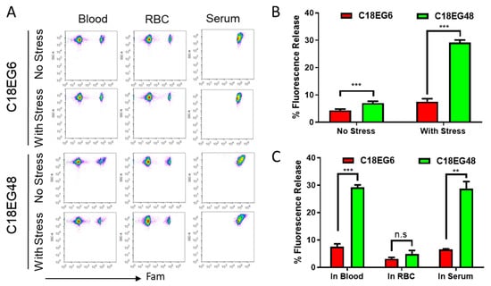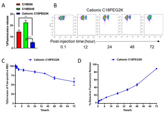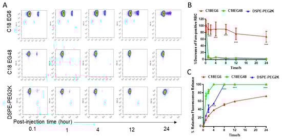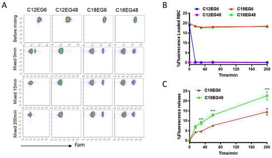 Figure 1A,B). It appeared that the dissociation of C12EG48 from the RBC surface was extremely rapid, as the Fam-positive population disappeared right after mixing with blood. By contrast, the frequency of Fam-positive cells remains constant in RBCs loaded with long lipid (C18) for more than 3 h, although their fluorescence intensity gradually decreased (