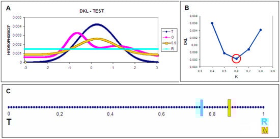 The DKL value expresses the distance between the two compared distributions on the entropy scale. As a consequence, the final analysis is based on a comparison of DKL for the O|T and the O|R relations, respectively. The relation DKL (O|T) < DKL (O|R) suggests a compatibility of the O and T distributions, which is interpreted as the presence of a hydrophobic core with the simultaneous exposure of hydrophilic residues on the surface (in accordance with the Gaussian function characteristics). To eliminate the need for two quantities, the parameter RD (Relative Distance) was introduced, expressed as follows: