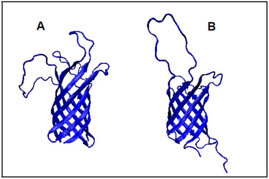 Differences can also be observed in the M distributions, which move ever closer to the straight line. The straight line parallel to the x-axis represents the R distribution. This distribution expresses the uniform distribution of the level of hydrophobicity throughout the protein body. This is interpreted as independence from environmental influences. This means that no environment (either polar to generate a centric hydrophobic core or hydrophobic, aiming at hydrophobicity exposure on the surface) has an effect on the molecule’s shape. The composition of the amino acid of such a molecule is an environmental field in itself. The presence of an R-type distribution in the protein is interpreted as constituting a field generated by the molecule itself, thus eliminating both effects of targeting. This is exactly the case with the 4N74 and 4K3C BamA structures. They are large molecules (379 and 532 amino acids, respectively). It is the number of molecules that, with their size dominance, can create an auto-environment that makes such a molecule independent of environmental influences. However, using the reference (idealized) distributions of T and M, we can quantify the state of the consensus present between these two idealized environments, leading to the generation of the structure present in these two membrane proteins. Figure 7 presents a comparison of the 3D structures of the proteins in question.