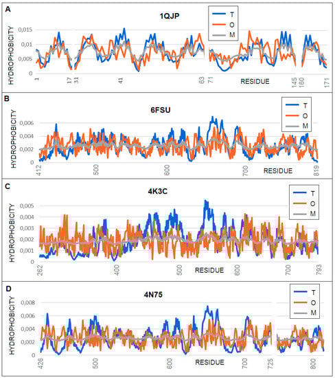 The beta-barrel proteins described in this section are characterized by a much larger barrel cross-section diameter (Table 3) than those discussed previously. It turns out, however, that even in this group with a clearly high degree of similarity at the super-secondary structure level, differentiation can be observed. The summary includes a protein with a diameter comparable to those previously discussed. There are considerable variations in the hydrophobicity profiles of members of this group, as shown in the differences in the K values calculated in this analysis. The 1QJP structure of OmpA (average internal diameter = 15. 9 Å; K = 0.4) closely resembles other beta-barrel proteins with a clear hydrophobic core, whereas the 3K3C structure of BamA (average internal diameter = 35.2 Å; K = 1.2) has a more polar interior. Similarly, the status of the beta-barrel itself changes with K from 0.6 to 1.3. The beta-barrel status is expressed by a higher RD (T–O–R) value relative to the complete molecule. This results in an increasing fit of the O distribution to the M distribution (versus the reference T distribution). The proteins discussed here are classic examples of the so-called “inverted” field on the K = 1 scale. This means that the polar and hydrophobic environment equally influence the formation of this transmembrane beta-barrel. The T and O profiles show both the exposure of hydrophobic residues on the surface (increased levels of hydrophobicity in places of exposure) and lowered levels of hydrophobicity in those sections constituting channel components (Figure 6).