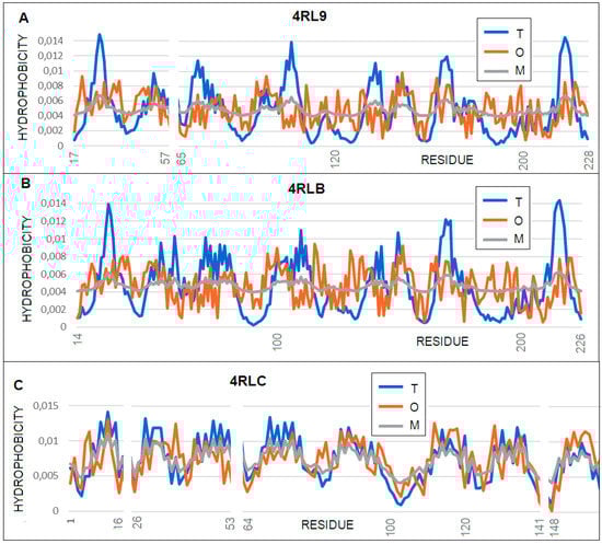 Profiles: T (blue), O (red), and M (gray) for: (A) 4RL9, profile M for K = 1.2; (B) 4RLB, profile M for K = 1.3; and (C) 4RLC, profile M for K = 0.3.