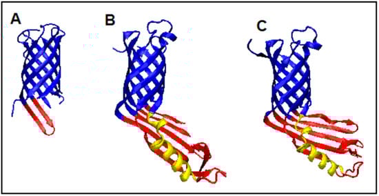 3D presentation of experimentally modified membrane protein structures showing the different statuses of the out-barrel part red. The helix distinguisher is in yellow. (A) 2RLC, (B) 2RL9, and (C) 2RLB.