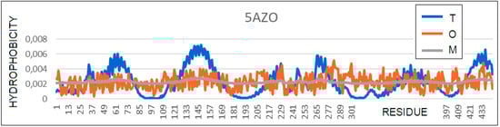 It is difficult to draw any specific conclusions from the 5AZO structure regarding the role of PAO1 in the antibiotic resistance, since the structure is not that of a complete protein complex. Nevertheless, the high K values for the entire dimer, the single chain, and the helix system clearly suggest the need for an environmental factor that would stabilize a significantly different hydrophobicity distribution compared to what appears to be common in an aqueous environment (Figure 13).