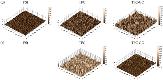 Figure 3c presents the degree of polymerization (I1547/I1585) used to quantify the degree of grafting, which increased from 0 for the PSf to 0.6 for the TFC and 1.0 for the TFC-GO. These features confirm the effective crosslinking of MPD and TMC in the TFC membrane, and the effective incorporation of GO nanoparticles enhanced the grafting of PA structures in the TFC-GO membrane.