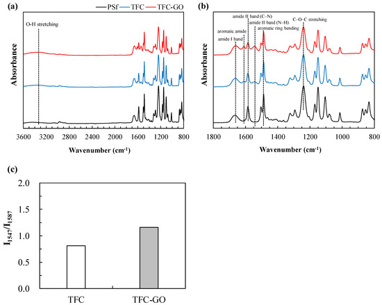 ATR-FTIR spectra of PSf, TFC, and TFC-GO membranes: (a) full scan with the wavenumbers in the range of 800–3600 cm−1, (b) zoom in with the wavenumbers in the range of 800–1800 cm−1, and (c) degree of grafting TFC and TFC-GO membranes.
