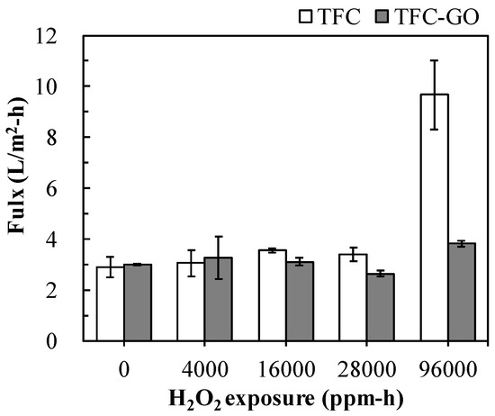 Figure 4 displays the contact angle of the TFC and TFC-GO membranes after an H2O2 exposure intensity of 0–96,000 ppm-h. In the absence of H2O2 exposure, the contact angle of the TFC-GO membrane (34.2°) was much lower than that of the TFC membrane (43.8°), indicating enhanced surface hydrophilicity. The contact angle of the prepared membranes in this study was superior than those of Chae et al. embedding 0, 15, 38, and 76 ppm GO in the PA layer of a TFC membrane with contact angle of 47.0°–75.0° [11]. With increasing H2O2 exposure intensity, the contact angle of the TFC membrane significantly decreased to 37.9° and gradually decreased to 22.1° at H2O2 exposure intensities of 4000 and 96,000 ppm-h, respectively. However, the contact angle of the TFC-GO membrane only slightly decreased to 26.5° and 31.7° after H2O2 exposure intensities of 4000 and 96,000 ppm-h, respectively. The results correlated well to low surface swelling, deformation of the TFC-GO observed using SEM (Figure 3c), and the increase permeate flux (Figure 5). Furthermore, the contact angle of both membranes after H2O2 exposure was much lower than those of the unexposed membranes, which is consistent with the findings of a study involving PA RO membranes exposed to chlorine [6]. The observed hydrophilicity increase could be attributed to the unbalanced dipole moments induced at the surface chains caused by surface oxidation [6,25]. H2O2 can form OH radicals on the membrane surface, which can cause the PA structure to be more vulnerable and can accelerate its degradation, thereby causing swelling and deformation of the PA layer [26]. The contact angle of the TFC-GO membrane was more stable than that of the TFC membrane, which may be due to the π–π interactions between graphitic domains, which can mitigate damage to the PA layer [40]. Chae et al. indicated that the TFC membranes embedding GO in the PA layer exhibited smoother surface with increasing hydrophilicity and negative surface charge [11]. These results demonstrated that incorporating GO nanoparticles into the PA layer modified the membrane surface characteristic and successfully enhanced its tolerance to H2O2, thereby increasing its chemical stability and surface hydrophilicity.