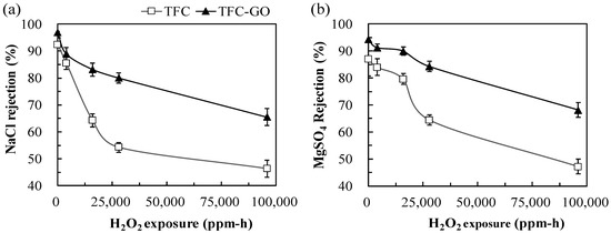 (a) NaCl and (b) MgSO4 rejection by TFC and TFC-GO membranes with the range of 0−28,000 ppm-h H2O2 exposure. Error bars represent one standard deviation of triplicate measurements.