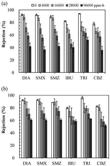 The separation performance of different salt solutions can vary greatly. Lai et al. embedded GO nanosheets on a PA layer to provide nanochannels with higher membrane surface hydrophilicity, permeate flux, and salt rejection (in an aqueous solution of 0.00087 w/v% GO aqueous solution decreased in the order MgSO4 > Na2SO4 > MgCl2 ≫ NaCl), as well as greater antifouling properties in dyes (Rose Bengal > Reactive Black 5 > Methyl Blue) [19]. Song et al. prepared a three-dimensional flower NF membrane with a PA layer modified using MIL-101(Cr) nanoparticles with abundant porous topological structures; the membrane exhibited increasing water flux with considerable variation in monovalent and divalent salt rejection (32–97% under 0.75 MPa, decreasing in the order of MgSO4 > Na2SO4 ≫ MgCl2 > NaCl) [20]. Therefore, in terms of TFC membrane separation performance, MgSO4 and NaCl as monovalent and divalent salts, respectively, have gained increasing attention in several applications, including desalination, water purification, and wastewater treatment [20,21,22]. Moreover, trace emerging contaminants, namely PPCPs, have been detected in groundwater and seawater and could not be completely removed in traditional treatment processes (i.e., drinking water/wastewater) [23,24]. Therefore, dense RO and NF membranes have attracted considerable attention for their capability to mitigate biological and organic fouling and improve PPCP removal for water reclamation. However, commonly used chemical cleaning agents, namely NaOCl and H2O2, can oxidize foulants with complex functional groups such as ketonic, aldehyde, or carboxyl groups [25]. Ling et al. reported that free chlorine species (HOCl and OCl−) can damage the PA layer of TFC membranes [26]. Compared with NaOCl, H2O2 may be preferable because it does not yield toxic by-products after reacting with organics, whereas NaOCl has been proven to form numerous disinfection by-products such as carcinogenic trihalomethanes and absorbable organic halogen [27,28].