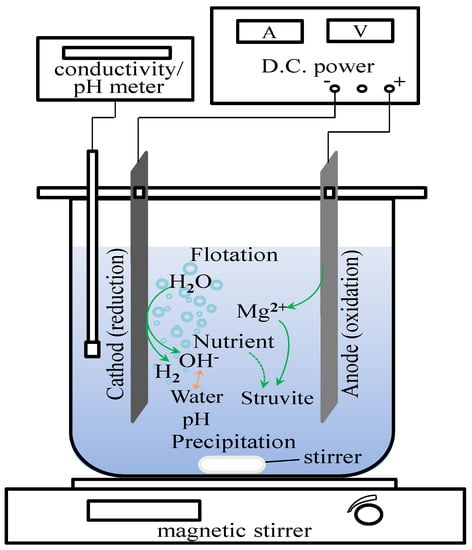 - Liu, W.; Li, J.; He, X.; Wang, Z.; Chun, Z. Factors influencing the removal of phosphorus and the purity of recycling struvite in wastewater by the electrochemical sacrificial magnesium anode method. Sci. Adv. Mater. 2019, 11, 128–134. [Google Scholar] [CrossRef]