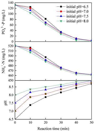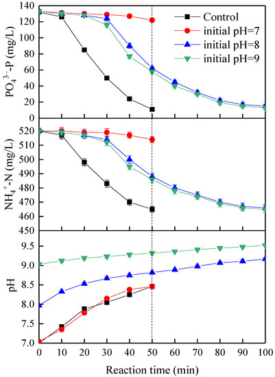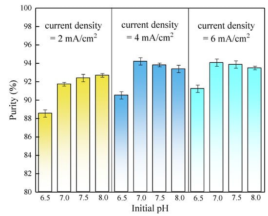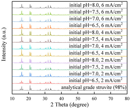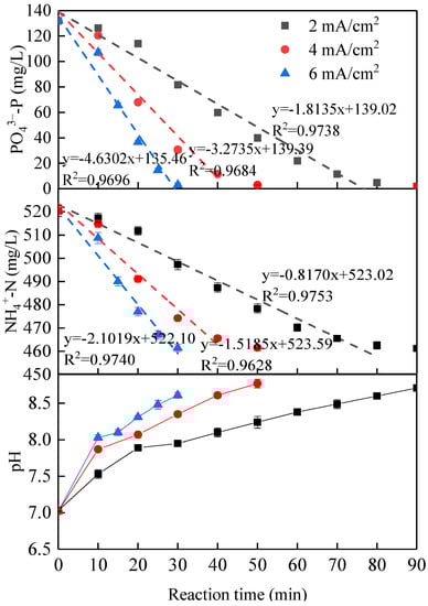 3.1. Effect of the Initial pH and Current Density on Struvite Electrochemical Precipitation Performance