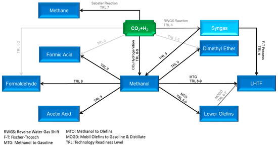 Carbon utilization pathways via thermocatalytic conversion with Technology Readiness Levels (TRLs) (blurred to sharp fonts denote low to high TRLs).