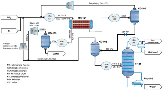 MR-based methanol production process flowsheet diagram simulated in Aspen HYSYS V11.