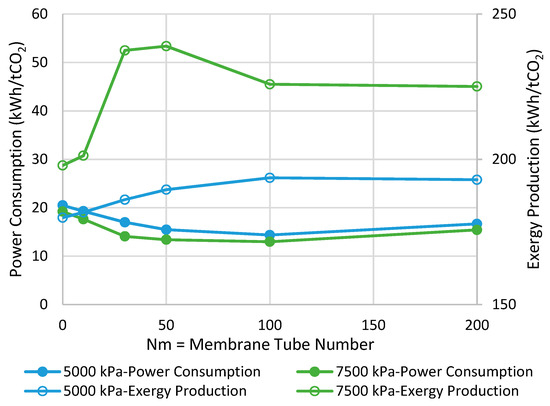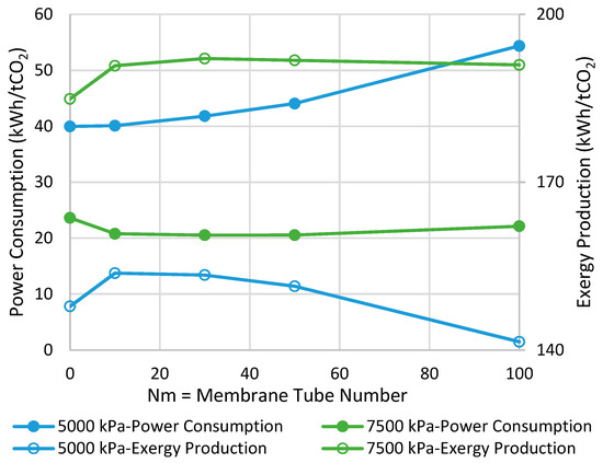 Comparison between isothermal CR- and MR-based processes with different membrane tube numbers using power consumption and exergy production (Nm = 0 corresponds to CR).