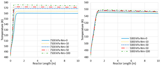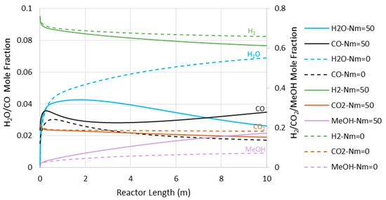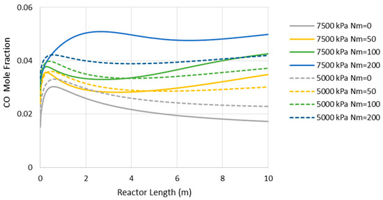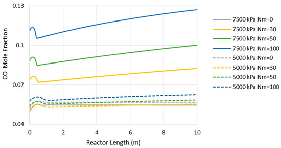 Figure 8 presents the CO concentration in the reactor’s feed versus Nm at the pressures of 5000 and 7500 kPa. Similar to the adiabatic scenario (Figure 5), the CO feed mole fraction increases (in other words, methanol selectivity decreases) with Nm. However, compared to the adiabatic cases, CO exists at much lower levels, implying higher methanol selectivity. The latter can also be confirmed by comparing Figure 6 and Figure 9, where the CO concentrations are shown throughout the reactor’s length. Moreover, in contrast to the adiabatic scenario, for the isothermal condition, the reactor’s active region significantly extends to the almost full reactor length by the use of membranes. Nevertheless, despite the continuous water removal and isothermal condition, the driving force for the reaction decreases throughout the reactor’s length due to the increases in methanol concentrations. According to Equation (4), the reaction rate drops as the methanol partial pressure increases.