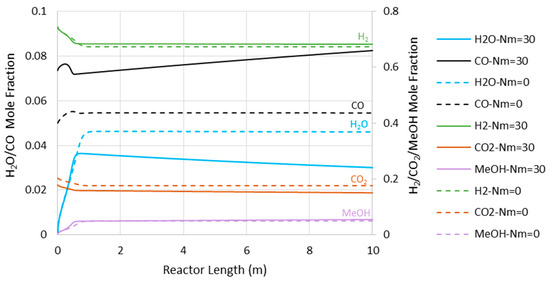 Figure 6 represents the concentration profiles for the existing species through the adiabatic CR and MR with Nm of 30 and 7500 kPa operating pressure (where the MR shows the highest impact). As shown, only the entrance section of the reactor is active. However, this active region of the reactor cannot be extended by the in situ water removal since the temperature rise as a dominating factor halts the reaction (see also Figure 4). After the temperature profile reaches 560 K for the CR and 569 K for the MR with Nm = 30, there are only slight changes in the species’ concentration, with some tendency toward CO production.