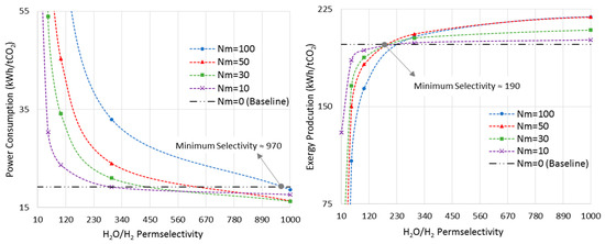 Figure 10 shows the power consumption and exergy production versus H2O/H2 permselectivity, in an isothermal MR-based process at the pressure of 7500 kPa, where the MRs showed the maximum improvements in both metrics (Section 6.2). As opposed to the last sections, in which the membrane was assumed to be permeable only to water, here we allow the H2O/H2 permselectivity to vary in order to realize the minimum requirement of this important parameter.