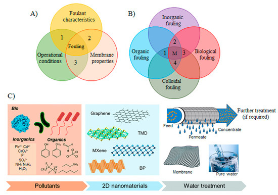 (A) Factors affecting the membrane fouling: (1) foulant characteristics such as concentration, size, solubility, diffusivity, hydrophobicity, charge, etc.; (2) membrane properties such as hydrophobicity, surface roughness, pore size, charge on membranes surface, and surface functional groups; (3) operational conditions such as flux, medium temperature, and flow velocity, medium chemistry, pH, ionic strength, and presence of organic/inorganic matters (reproduced from [31] with permission from the Elsevier. (B) A schematic graphic of the various fouling mechanisms corresponding to the fouling materials. In the real membrane processes, fouling occurs as mixed fouling, i.e., the combination of different fouling mechanisms happening concurrently. The dotted lines in the diagram with areas 1, 2, 3, 4 and M show the different examples of mixed fouling between two or more fouling mechanisms. (C) A schematic illustration of the water/wastewater treatment processes utilizing the versatile behavior of 2DNMs in efficient membrane separation (reproduced from [39] with permission from the Royal Society of Chemistry).