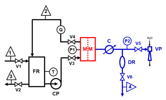 VMD tests were carried out through the laboratory-scale plant sketched in Figure 1. The membrane was housed in a rectangular cell (MM) with an effective membrane area of 22 cm2 and a channel height of 2 mm. The cell was fed at a constant flow rate of 500 L/h, measured through a variable area flow meter (Q) and pressure of 0.1 bar, measured by bourdon gauge (P1), through a magnetic centrifugal pump (CP) (mod. P051, Plastomec, IT; maximum capacity Q = 50 L/min, max head, H = 0.6 bar). Feed temperature of 40 °C was measured by a glass thermometer (T) immersed in a 2 L glass feed reservoir (FR) placed on a hot plate (not shown in Figure 1) with a proportional integrative derivative (PID) control. A water-jet vacuum pump (VP) was used for generating a pressure of 25 mbar measured through a vacuum gauge (P2). Distillate vapour was condensed through a glass condenser (C). A mixture of ethylene glycol and water kept at 0 °C was used as cooling fluid. Distillate flow rate was measured through the volume of distillate collected in a graduated glass cylinder (DR) after 10 min. All relevant parts of the feed recirculation loop were made in polypropylene (PP). A silicon rubber vacuum hose was used to connect the various vacuum line devices.