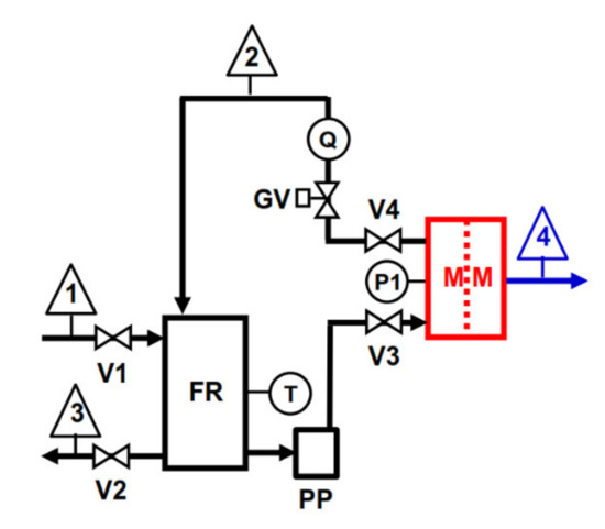 Laboratory-scale RO plant scheme: 1 = feed inlet; 2 = concentrate outlet (recycled); 3 = feed outlet; 4 = permeate outlet (recycled).