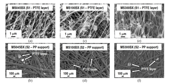 FESEM micrographs of the two surfaces (S1—PTFE layer and S2—PP support) of MS membranes. (a,b) MS045BX; (c,d) MS100BX; (e,f) MS300BX.