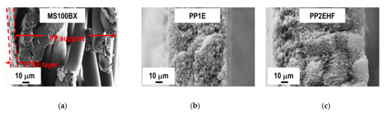 FESEM micrographs of the cross-section of the MS100BX (a), PP1E (b), and PP2EHF (c) membranes.