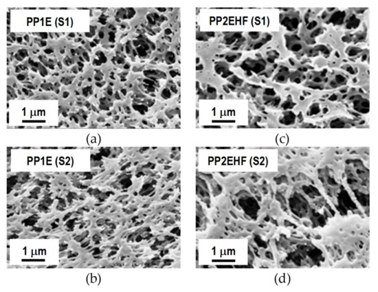 FESEM micrographs of the two surfaces (S1 and S2) of PP1E (a,b) and PP2EHF (c,d) membranes.
