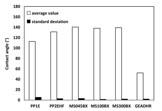 Figure 6 shows the water contact angle on the PP and PTFE MS membranes used in membrane distillation and the RO membrane. The membranes used for MD are clearly hydrophobic and PTFE MS membrane made of PTFE, exhibiting a contact angle approaching at 140°, higher than that of PP membranes. The PP2HF membrane exhibits a water contact angle higher than that of the PP1 membrane, probably owing to the higher surface porosity. The RO membrane shows a hydrophilic behavior with a water contact angle of about 45°, as expected because thin film composite membranes are usually made of a polymer as well as polyamide, which should allow a good solubility and diffusion of water.
