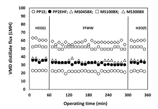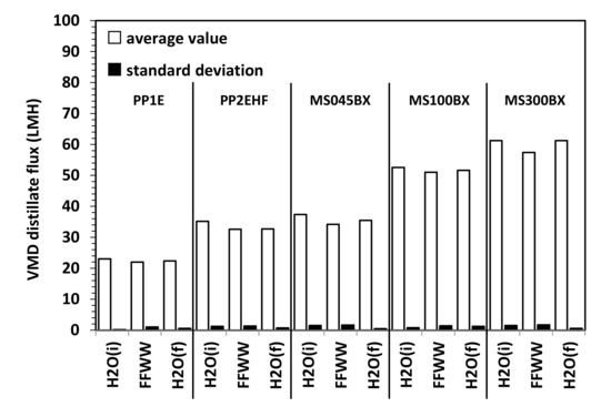 Figure 7 and Figure 8 refer to the results of VMD tests. As shown in Figure 7 for all membranes, only small fluctuations of the distillate flux (expressed in Lm−2 h−1 = LMH) connected to small changes of the temperature and vacuum pressure are observed. For the sake of a better comparison, average fluxes along with standard deviations (SD) are shown in Figure 8. The distillate flux with FFWW appears only slightly lower that than measured at the beginning of the VMD test with pure water, H2O (i). The distillate flux is higher for the thinner PTFE MS membranes and increases with the increasing pore size and decreasing bubble point (Table 1). For the same type of membranes, there is a good agreement between the evolution of the distillate flow and the porous structure of the selective layer observed by the FESEM images. The phenomenon is best seen in the case of PP AccurelTM membranes, which have a less complex porous structure than that of MS membranes. For the latter ones, however, it can be observed how the MS100BX and MS300BX membranes with a very similar porous structure (despite the different nominal size of the pores) offer very close distillate flux. By repeating the pure water test, H2O (f), after wastewater treatment, an almost complete recovery of the initial pure water flux H2O (i) is obtained for all types of membranes.