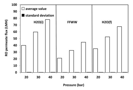 Figure 9 refers to RO tests carried at different operating pressures. Average values are considered as the permeate flux remained substantially constant with time during the various tests with fluctuations even smaller that of those observed during VMD tests, as the comparison of SD values reported in Figure 8 and Figure 9 reveals. As it can be seen from Figure 9 as well as from the RFR values reported in Figure 10 that, by feeding the RO plant with FFWW, a decay of the permeate flux much higher than that found for VMD is observed. The RFR gives an indication of the fouling occurred during the operation and FRR gives an indication of how easily the original flux can be recovered just by a simple water washing. Figure 9 shows that the flux during FFWW treatment at 20 bar is 21.2 LMH, a value slightly lower than that of the less permeable VMD membrane (PP1E, 22 LMH) (Figure 8). By increasing the pressure at 30 bar, the flux reaches a value, 32.6 LMH, similar to that of PP2HE membrane, but slightly lower than that of MS045BX membrane (34.2 LMH). A further increase in the pressure at 40 bar leads the flux to a value (44.7 LMH) much lower than that of PTFE MS100BX (51 LMH) and PTFE MS300BX membrane (57.4 LMH). From the above reported RO permeate flux and pressure data, an average permeability value of 1.09 ± 0.03 LMH/bar can be calculated. Therefore, it is easy to verify that the highest flux obtained from VMD tests can be hypothetically reached by increasing the RO pressure up to 52.7 bar—a value that, apart from the increase in pumping and energy cost, can favour polarisation and fouling phenomena. Dolar et al. [21] investigated the performance of four different RO membrane at 25 bar operating pressure with a wastewater (neutralized to a pH near 6) much less concentrated (EC = 2020 µs/cm; F- = 18.7 mg/L; P2O5 = 2.4 mg/L) than that treated by us (Table 3). The authors measured permeate fluxes from 25.5 LMH to 30.5 LMH, slightly higher than those shown in Figure 9, and found a RFR of ≈21% for one of the three RO membranes and, almost surprisingly for the low concentration of the wastewater, a RFR ranging from ≈55% to ≈62% for the remaining two membranes. Unfortunately, no comparison can be made with the wastewaters considered by Karabelas et al. [20], as the authors supply neither permeate flux values nor useful indications (e.g., flow rate, membrane surface) to calculate these values.