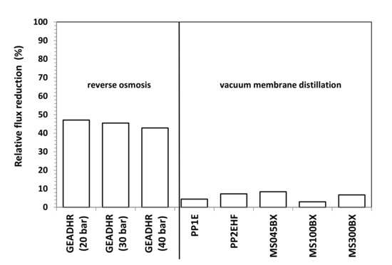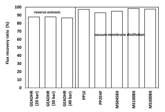 By measuring the pure water flux H2O (f) again after FFWW treatment, only a partial recovery of the initial pure water flux, H2O (i), is obtained (Figure 9), as it can be seen better from the FRR values shown in Figure 11. The FRR is taken as a measure of membrane fouling; the lower the former, the high the latter. Therefore, from the comparison of the results shown in Figure 11 to those reported in Figure 10, it is apparent that MD has a lower fouling tendency than RO. Dolar et al. [21] had to use alkali and acid cleaning agents to remove foulants from the RO membranes and to obtain an FRR from ≈66% to ≈99%, depending on the RO membrane. The higher tendency to fouling of the RO membrane can be ascribed to its hydrophilic character.