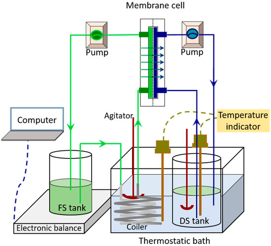 Our previous work [17] developed a laboratory-scale FO unit utilizing a flat-sheet cellulose triacetate (CTA) membrane, as shown in Figure 1. A membrane cell with an effective membrane area of 0.003315 m2 was used. Two peristaltic pumps (BT600SV2-CE, Lead Fluid Technology Co., Ltd., Baoding, China. Pump head: YZ15; tubing size: 25#) were used to continuously inject feed and draw solution into the membrane cell. The temperature of both feed and draw solution was maintained constant before entering the membrane cell by a thermostatic bath (SDC-6, SCIENTZ, Co. Ltd., Ningbo, China). An electronic balance with an accuracy of 0.01 g (CP4102, Ohaus, Co. Ltd., NJ, USA) connected to a computer was used to record the mass variation in the feed tank over time (every 1 min).