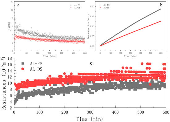 As shown in Figure 2b, the concentration factor increased with the continuous progress of the forward osmosis process. At the 600th minute, the concentration factors were 1.187 (AL-FS) and 1.125 (AL-DS), respectively. As shown in Figure 2b, the concentration efficiency of the AL-FS mode was always higher than that of the AL-DS mode. When the established concentration factor was 1.125, the AL-FS mode could reach in 373 min, and AL-DS took 60% more time (that was, 226 min) to reach the same concentration factor.