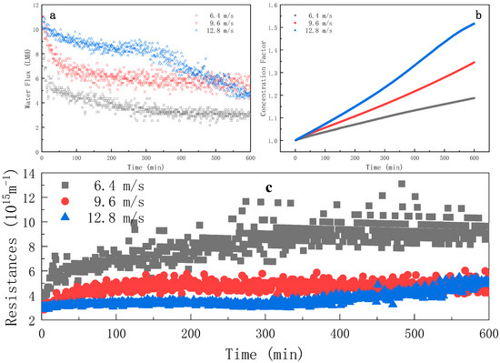 The water flux evolution of Figure 3a indicates that the increasing cross-flow rate could obviously increase the water flux. Under the three cross-flow rates, the trend of water flux in the first 300 min was the same. The water fluxes decreased rapidly from 0 to 100 min; then, slowed down to reach a pseudo-steady state from 100 to 300 min. After 300 min, the water flux at the cross-flow rates of 6.4 m·s−1 and 9.6 m·s−1 tended to be stable, but that of 12.8 m·s−1 decreased abruptly. The resistance evolution in Figure 3c shows that the increase in cross-flow rate could effectively reduce the process resistance, which indicates that the additional shear force generated by the increased cross-flow effectively hindered foulants from accumulating on the membrane surface [14,15,16,17]. When the cross-flow rate was 12.8 m·s−1, the total resistance slightly increased from 0 to 300 min, followed by a sudden increase after 300 min; such a phenomenon will be further discussed in Section 3.1.3.