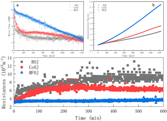 It can be seen from Figure 4c that the water flux of the microfiltrated orange juice (MFOJ) decreased obviously in 0–300 min, but the total resistance was basically unchanged. The total resistance included the membrane resistance, fouling resistance and concentration polarization resistance. As indicated in Section 3.4, the MFOJ had removed the main pollutants, so the fouling resistance could be ignored, which implies that the concentration polarization resistance was basically constant from 0 to 600 min (only a slight increase at the beginning). It is then assumed that the decline of the water flux mainly resulted from the decrease in osmotic pressure difference, the driving force of FO in this circumstance.