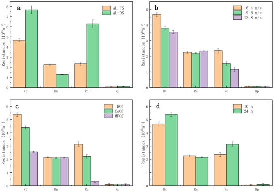 Comparison of process resistance of different (a) membrane orientations, (b) shear rates, (c) pretreatments and (d) running durations.