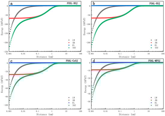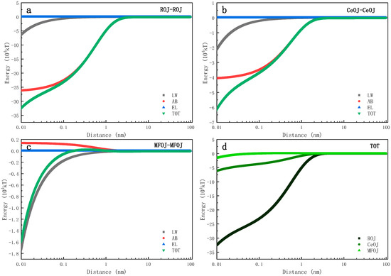 Figure 7 shows the evolution of the interfacial interaction energy between one feed solute and another over a distance in the FO process for concentration. The evolution trends of the interaction energy of ROJ–ROJ and CeOJ–CeOJ were quite similar (Figure 7a,b) and always in the negative range, which indicates that the attractive force dominated those involved interfaces, implying that the later-coming solutes were easy to attach to the settled one, resulting in an easy growth scenario of membrane fouling. On the contrary, the evolution of the interaction energy for MFOJ–MFOJ (Figure 7c) showed distinctive features. When the distance of interface was 0.16 nm~1.50 nm, the total interfacial interaction energy was positive, indicating the repulsive force between feed solutes. In fact, the AB interaction energy was always positive within 1 nm in this case, leading to an important decrease in the total interaction energy (towards zero) compared to that of the ROJ or CeOJ, as shown in Figure 7d. Such revelation suggests that the pretreatment of microfiltration can effectively prevent the fouling layer from growing.