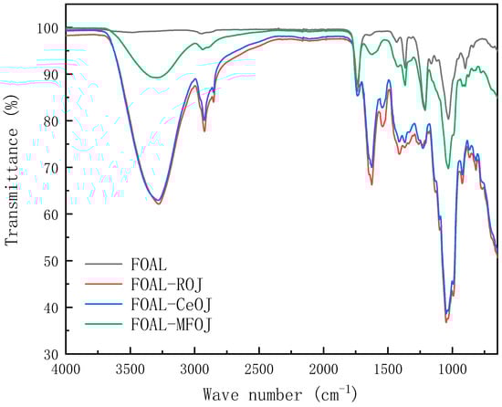 An amount of 3279 cm−1 represented the stretching and vibration of the O–H bond in the hydroxyl functional groups, and the sharp peak at 2923 cm−1 related to the stretching of the C–H bond was observed [47]. These adsorption peaks indicated the presence of polysaccharides or polysaccharide-like substances in the fouling layer. Furthermore, the peak at 1031 cm−1 was also attributed to polysaccharides or polysaccharide-like substances [48]. Moreover, two sharp absorbance peaks appeared at 1635 cm−1 and 1545 cm−1 corresponding to amides I (C=O stretching) and II (N–H in plane), indicating that the membrane surface contaminants contained amino and carboxyl functional groups, representing the existence of proteins or protein substances [49]. The spectrum of the MFOJ basically retained the original characteristic peak of the pristine membrane. Compared with the fouling of the ROJ and CeOJ, the absorption peak of the MFOJ decreased obviously at 3279 cm−1, and there was only a weak absorption peak at 2923 cm−1 and 1635 cm−1.